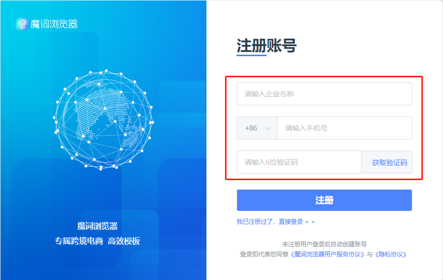 2、输入企业名称、手机号,获取验证码后,即成功注册魔词浏览器账号。
